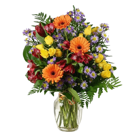 • 3 orange germinis, 3 purple montecasino, 3 yellow spray roses, 3 red alstroemeria